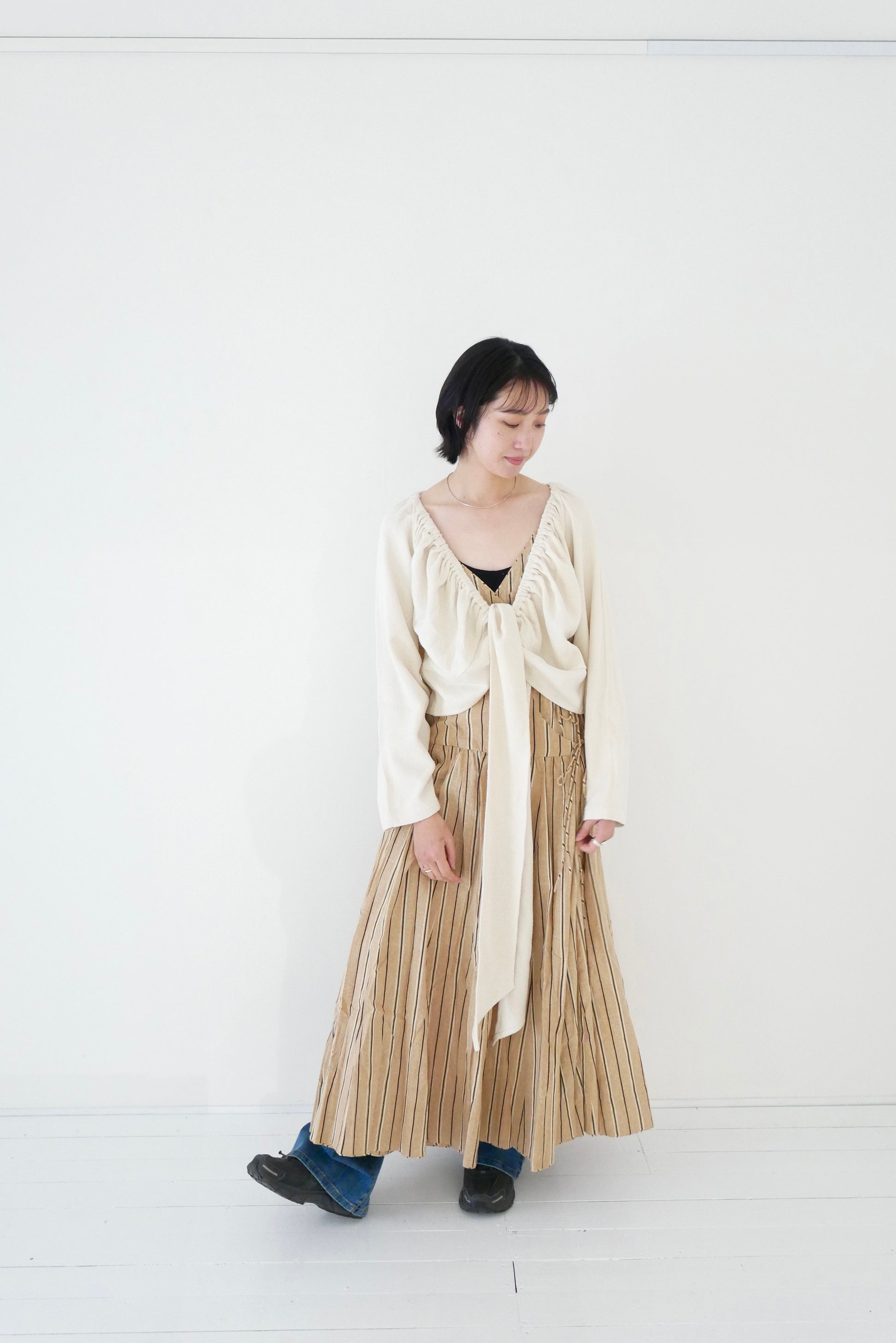 デザインはカシュクール型のカーディガンブラウス。広めのアームホールでゆとりを持たせ、リボンをウエストで結ぶことでメリハリのあるシルエットに。同素材のパンツとのセットアップもおすすめです。”