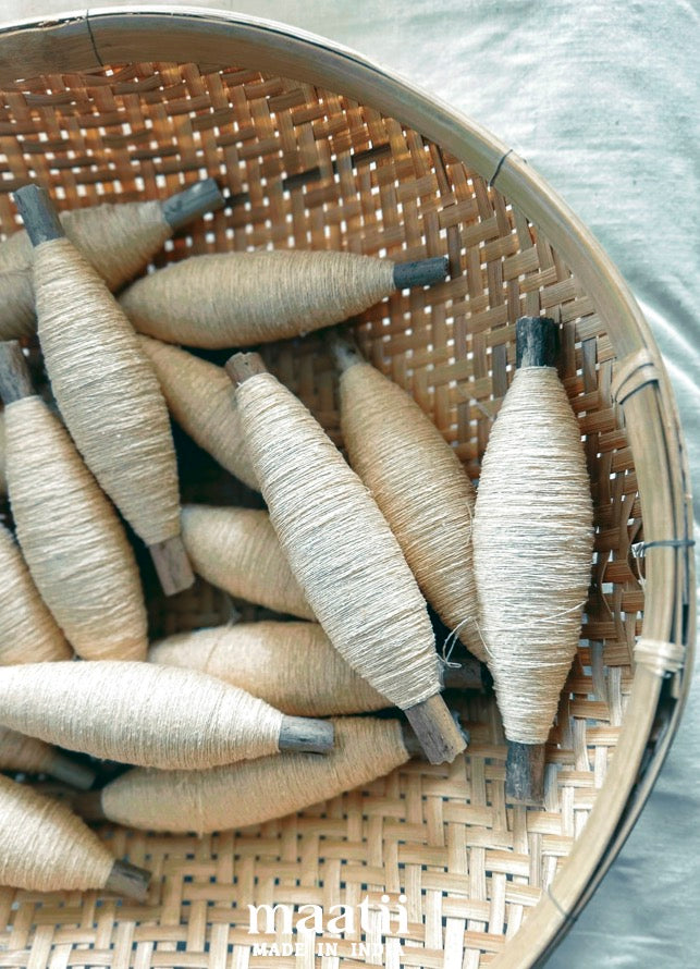 ”東インドで織られるタッサーシルクは、沙羅双樹やアルジュンの葉を食べて育った野蚕から採れる、インド原産の希少な絹糸です。その糸を「マトカ」と呼ばれる素焼きの壺で製糸したものがマトカシルク。さらに、絹紡糸を取った後の落ち綿から作られるノイル糸を加えることで、凹凸感とネップのある豊かな表情を生み出しています。タッサー特有のシャリ感と光沢に、ツイル織りでデニムのような強さと柔らかさを加えた生地に仕上げました。