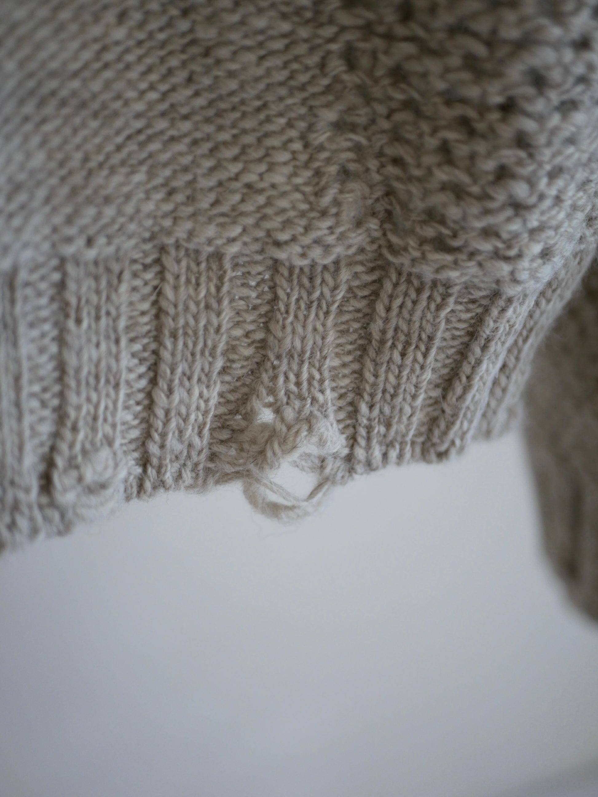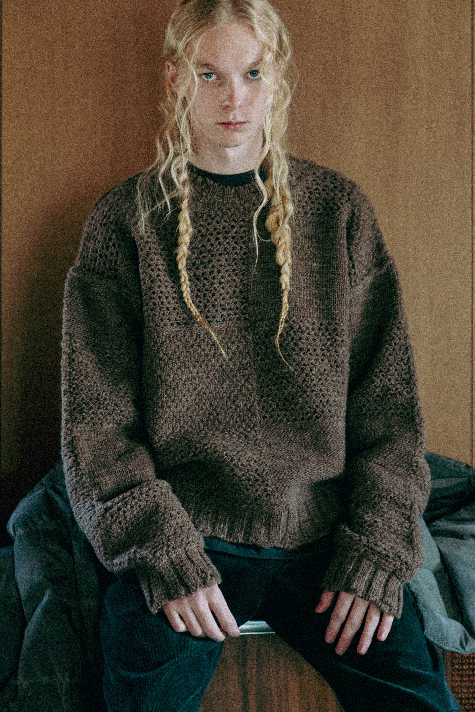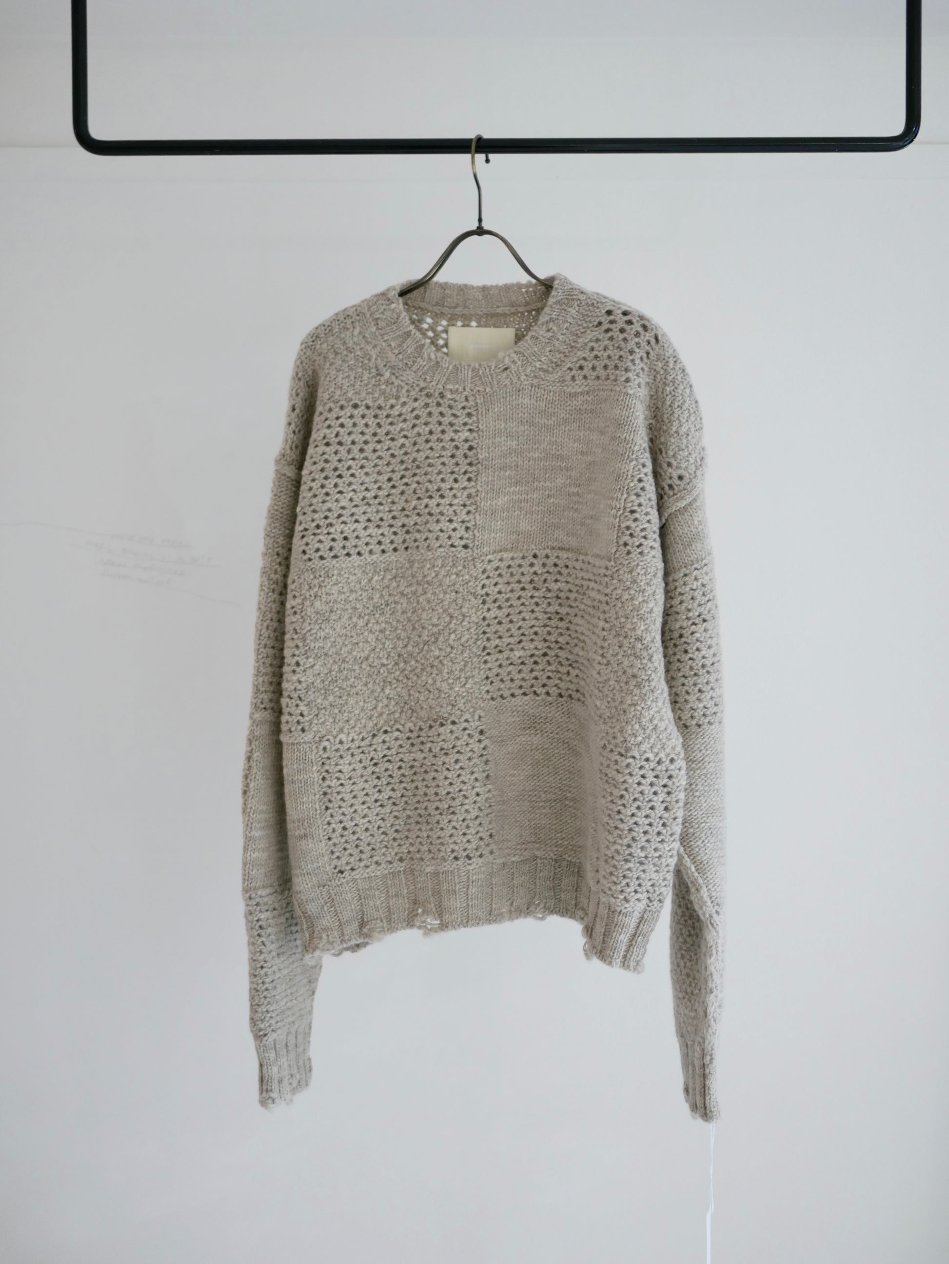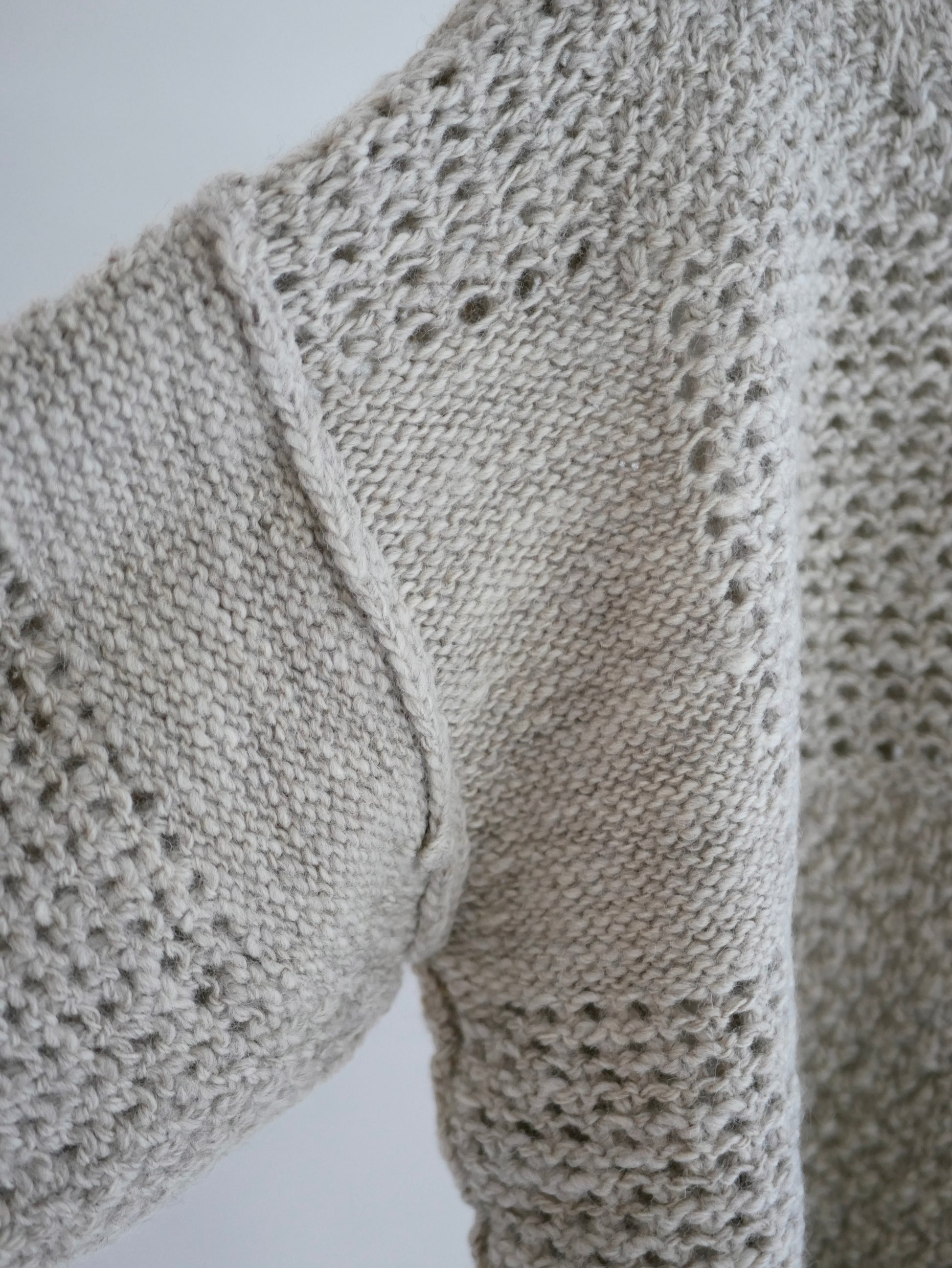 "表編み、裏編み、透かし編みをパッチワーク切り替えをしたプルオーバーセーター。