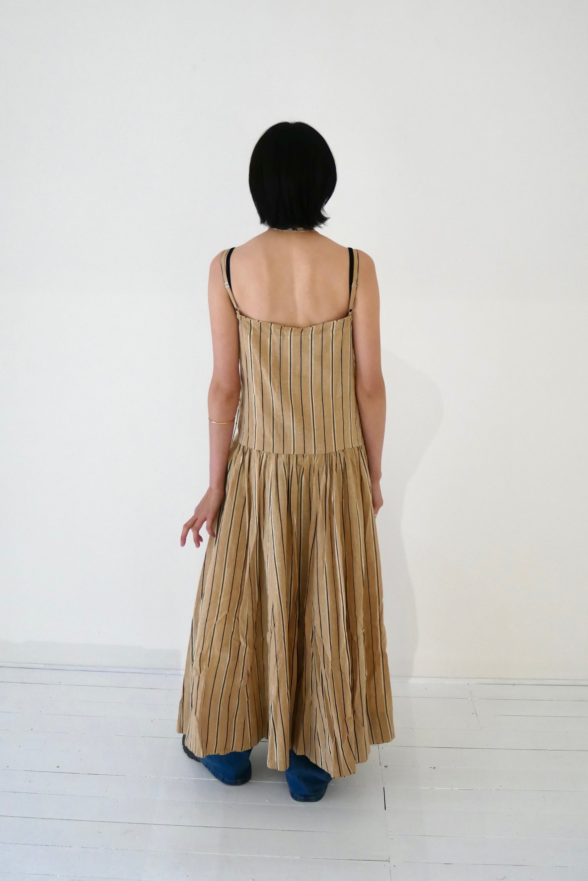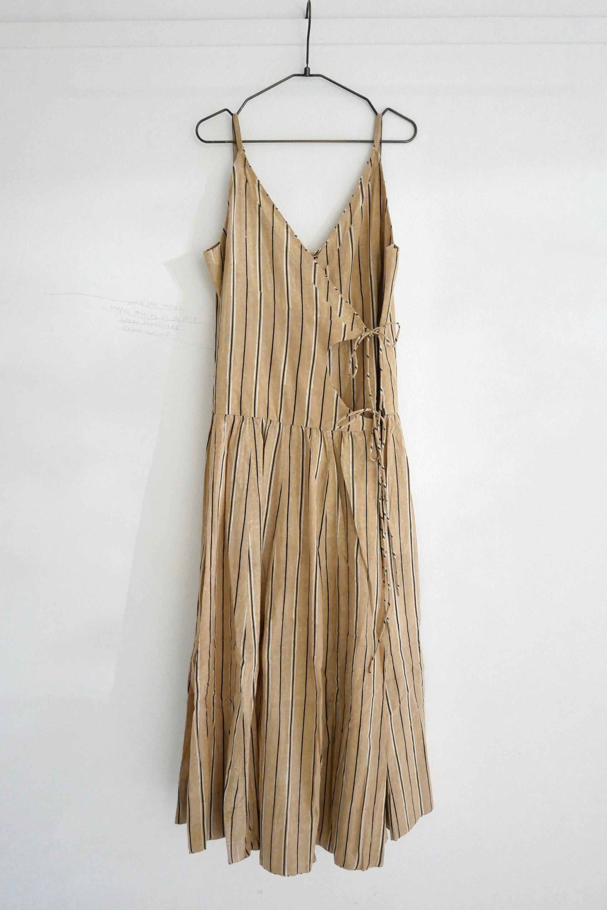 ”熟練の技を要する手つむぎの100番単糸を使用し、やわらかく軽や かに手織りされた生地です。糸の節が生む自然な表情が魅力。 そこに、インドならではの木版プリントを施し、職人が一点ずつ彫り上げ た木版によって、有機的で味わいのあるラインを描きました。版のズレや かすれも手仕事の証として、一枚ごとに異なる唯一無二の表情を楽しめる 生地です。 華奢な肩紐は長さの調整が可能で、体にしなやかに寄り添う上品なシル エットを描きます。 インナー次第で表情が変わり、一枚で女性らしさを引き立てる着こなしか ら、カーディガンやタートルネックを重ねたレイヤードスタイルまで、 オールシーズン楽しめる万能アイテム。 軽やかでありながら、どこか品のある佇まいが魅力の一枚です。”